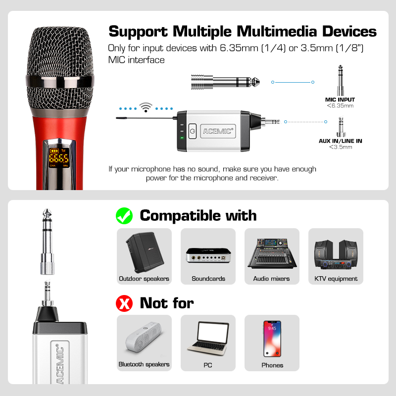 【2 Audio Jack Supports & Wide Compatibility】The UHF wireless headset microphone system supports 1/8"(3.5mm) and 1/4"(6.35mm) jack we provided, which can be used with portable pa system, karaoke machine, voice amplifier, mixer, large power speakers, multimedia, bus speaker etc.