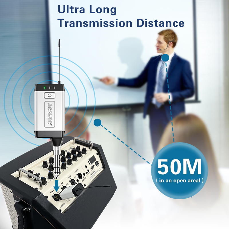 【For Two People】The dual wireless headset microphone system can be used by two people at the same time. Freely match the headset you want, of course, you can also use only one microphone. The working method is to pair two transmitters with a receiver, so your device only needs to have a microphone jack to complete the work of two people. No set, plug and play. 164 feet (50m) stable transmission distance at open area, delivering loud, clear and high fidelity sound quality to your audience.