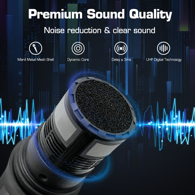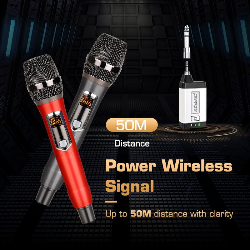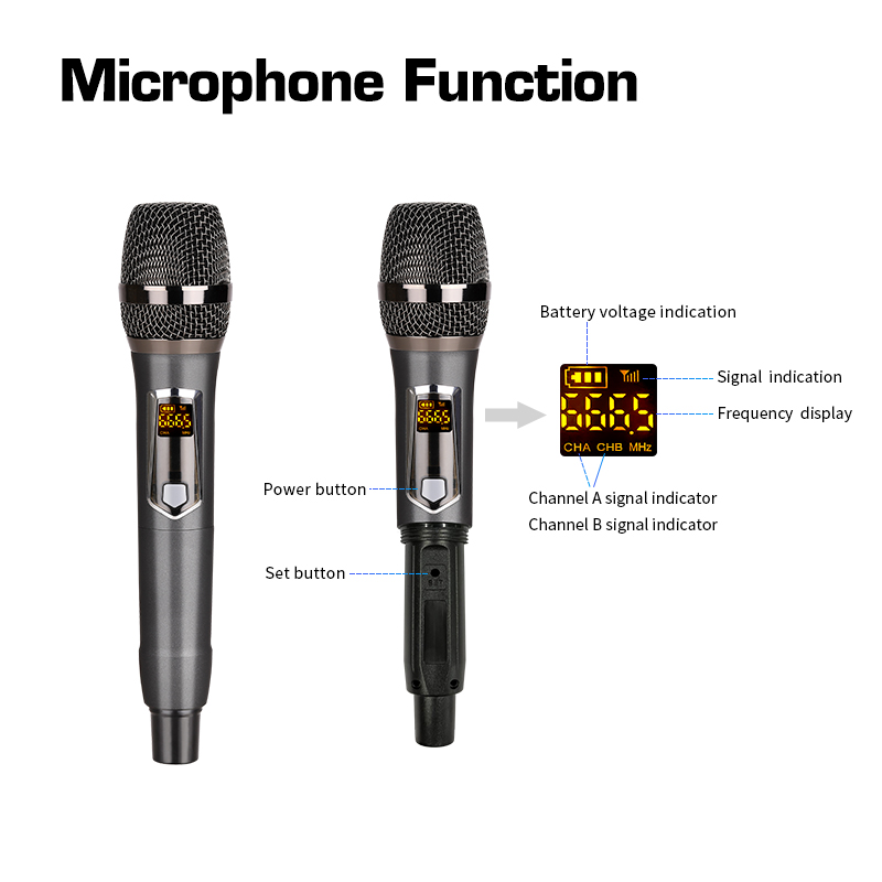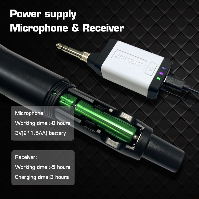 【 Rechargeable & LED Display】The receiver can be rechargeable. No need to set! The transmitter requires 2 AA alkaline batteries which can last for about 8 hours, the receiver's lithium battery can last for 6 hours. The wireless handheld microphone has a LED display, so you can clearly see the battery, channel and signal., don't worry about suddenly not working.