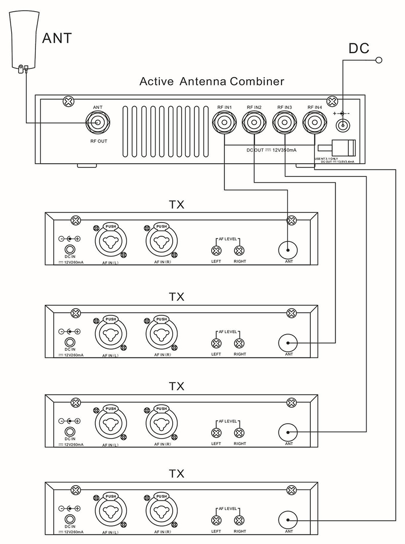 Engineered for efficiency, the AC-600 antenna combiner supports up to four wireless stereo transmitters through a single shared antenna, significantly reducing antenna clutter and improving signal consistency across your setup. By delivering power directly to the transmitters via BNC cables using the included power supply, this combiner eliminates the need for separate power units, simplifying system setup and enhancing reliability.