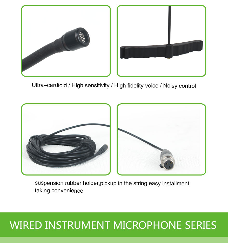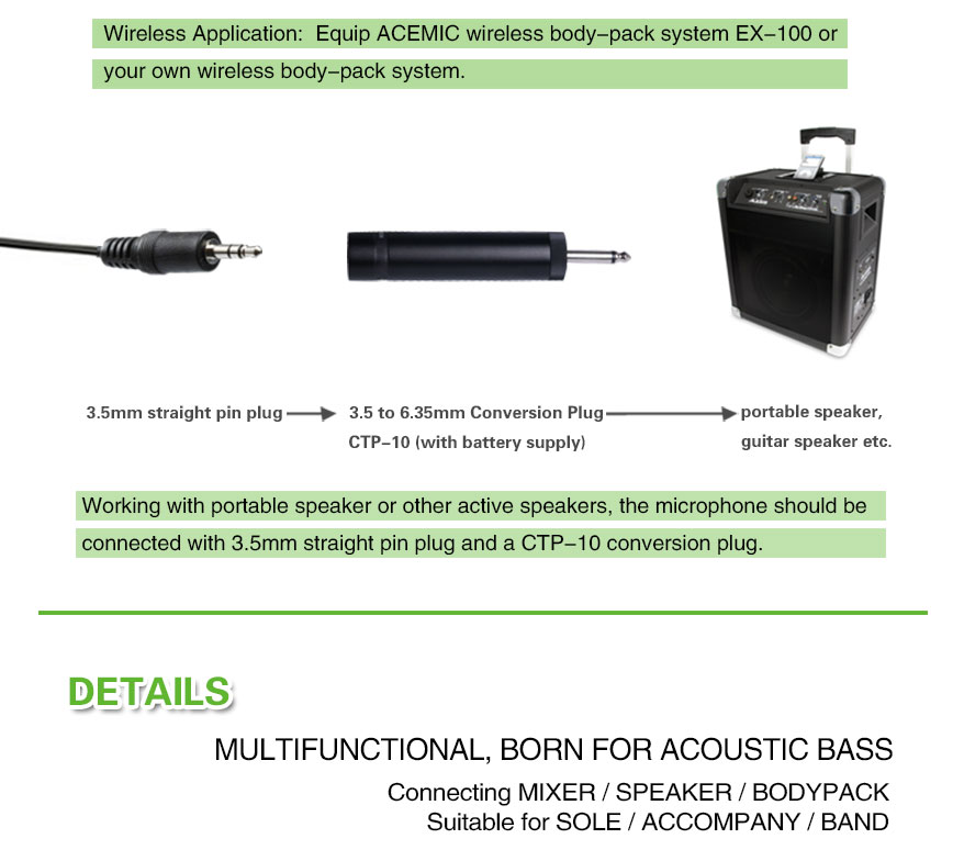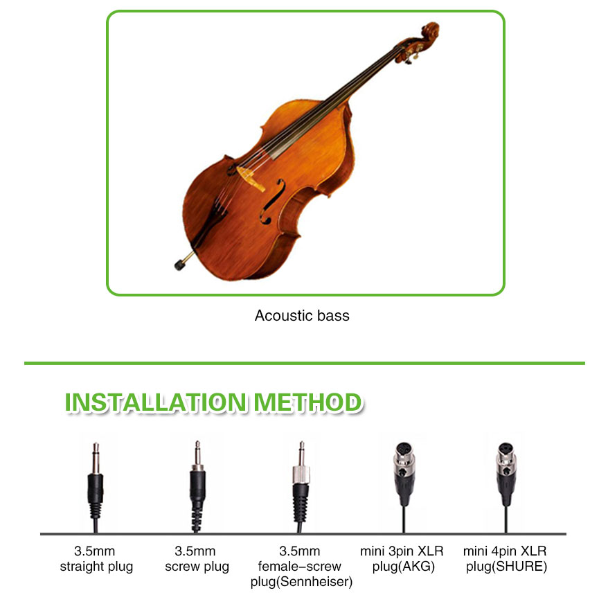 Microphone type: CondenserDirectivity: Omni-directionalCartridge size: Φ4.0*1.5mmSensitivity: - 47db±2dBFrequency response: 65Hz-8KHzOutput impedance: ≤2.2 kΩWorking voltage: 2.0V-10V.DCARM: 160MMS/N ratio: >63dBCable length: 1.2m standard, 3m optionalFitting Instrument: Double Bass