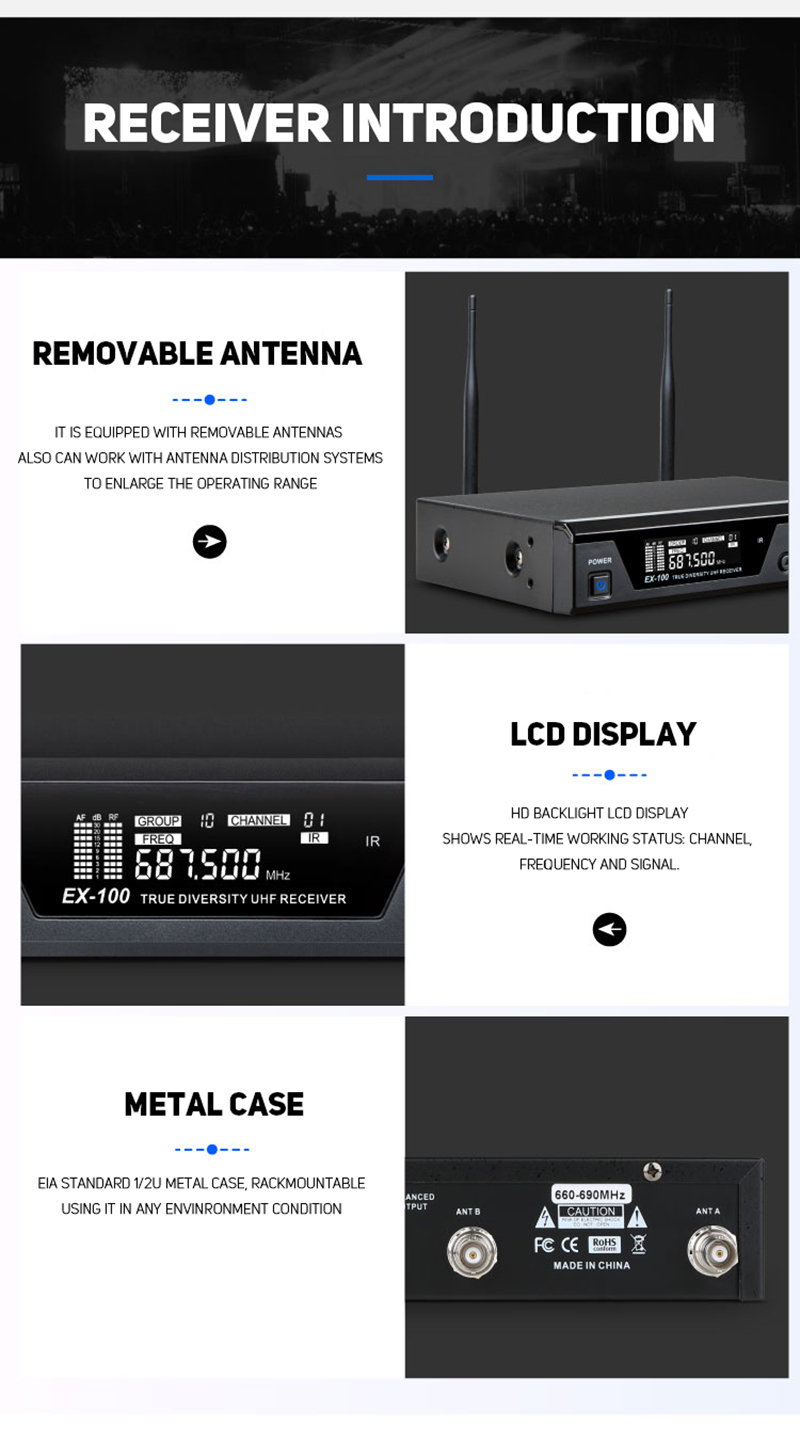 Introducing the EX-100/ST-4 wireless saxophone microphone - a professional-grade solution engineered for saxophonists and brass musicians seeking top-tier wireless performance. This system combines advanced UHF technology with a robust, musician-friendly design, ensuring reliable, high-quality audio transmission in any performance setting