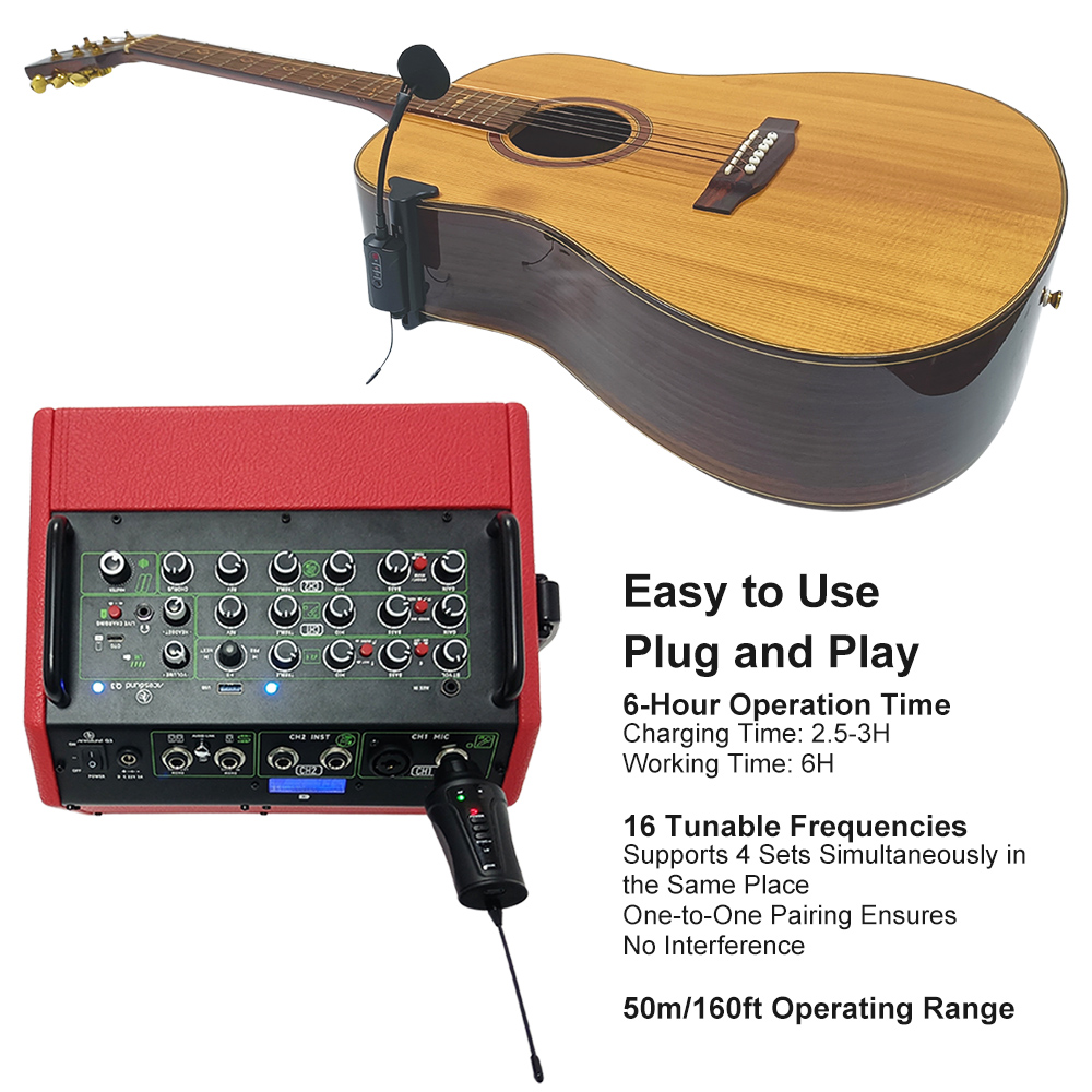【Multi-scenario】The versatile wireless guitar microphone is ideal for a range of performances, including live gigs, solo performances, accompaniment performances, personal entertainment, school stage performances, personal practices, and small concerts. And you can use 4 systems simultaneously within the same frequency band.