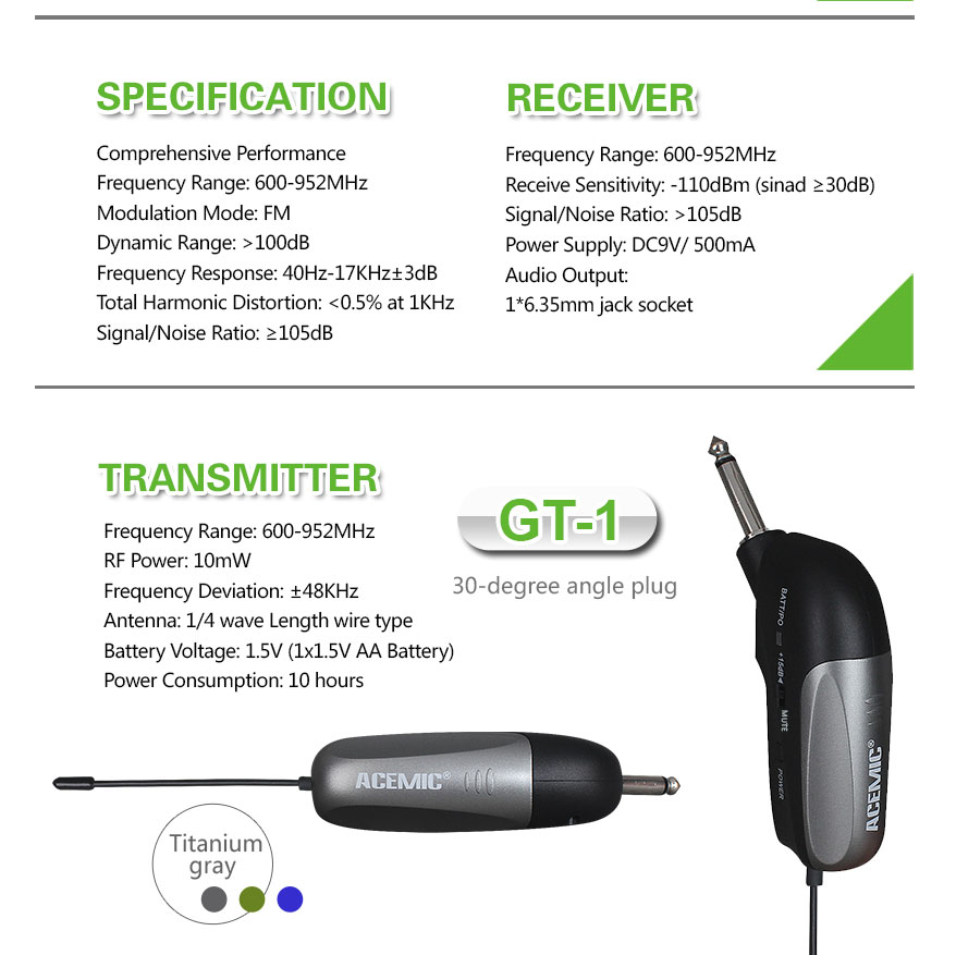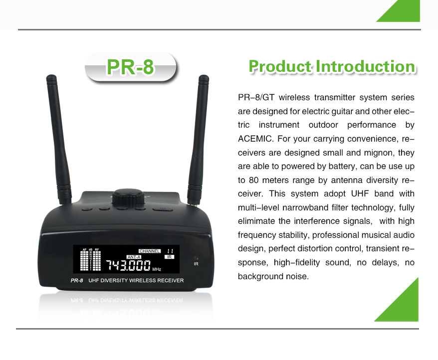 About this item:• Ideal for the gigging guitar or bass player, the PR-8/GT wireless guitar system offers quality sound, dependable performance, and simple setup. It features a compact GT plug-in guitar transmitter with a two selectable connectors GT-1(30°Angle) and GT-2(90°Angle) that plugs into a variety of instrument jacks, including acoustic/electric and bass guitars, electric violins, and even accordions.• Designed to be an extension of your instrument, the wireless guitar system delivers a true wireless experience with no bodypack and no cable, allowing you to move freely around the stage during rehearsals or performances—interacting with other musicians and the audience.• The PR-8/GT wireless guitar system includes a PR-8 receiver, which can be placed on top of your amp or securely rackmounted in a portable flight case using the necessary hardware. Two output connectors allow you to connect the receiver to an amplifier, sound system, or recording board.• The wireless transmitter provides up to 10 hours of continuous use on a single AA battery. The 262ft (80m) operating range offers ample coverage for small to mid-size venues. For gigs where several musicians use wireless, up to 8 systems can operate simultaneously in each frequency band.Versatile Plug-In Electric Wireless Guitar System's Transmitter for Cable-Free Movement• The GT guitar wireless transmitter plugs directly into your instrument (no beltpack or cable required)• Designed with two selectable connectors , GT-1(30°Angle) and GT-2(90°Angle) , it can fit both Fender-style (Stratocaster) and Gibson-style electric guitar output jacks.• The audio mute switch is easily accessible for silent instrument swaps.• The dual-color LED indicator shows low battery, power output statuses.• One AA battery (available separately) provides up to 10 hours of use.