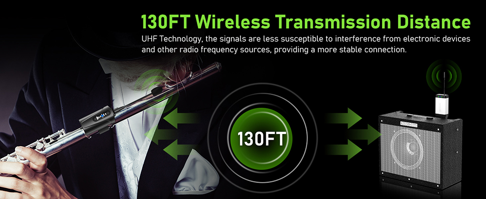 【UHF Stable Transmission】The wireless flute microphone utilizes UHF frequency and advanced digital audio transmission technology, featuring infrared automatic pairing, a 48kHz sampling rate, and an ultra-short audio delay. This ensures sound transmission with recording-quality clarity. The system offers stable transmission up to 40 meters (132ft) in open areas. (Note: Please ensure the antenna on the bottom of the receiver is installed before formal use.)