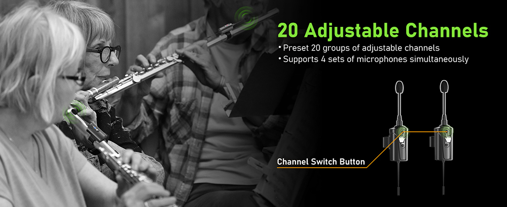 【20 Preset Channels】The wireless flute microphone offers 20 adjustable preset channels to minimize potential interference and supports up to 4 systems for simultaneous use on the same occasion. To pair the systems: Short press the channel switching button of the transmitter, and the corresponding channel indicator flashes. This indicates that the channel has been automatically switched.