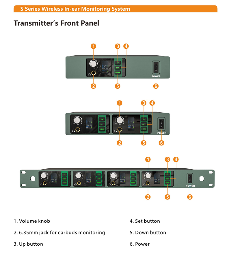 (660-690 MHz Optional), (USA: 902-928, UK: 823-832, ROK: 925-937 MHz)Modulation:IntegratedAudio sampling:24bit/48KHzT.H.D:<0.5%@1KHzFrequency response:20Hz-20KHz(±3dB)Stereo separation:≥60dB @1KHzOutput jack:3.5mmφ stereo earbuds jackOutput power of earbuds:80mW@32Ω THD+N = 1%Latency:6ms ( typical)Frequency match:Adjust manuallyPower supply:1.5V AA battery x 2Battery life:≥6 hoursOperating range:80 meters (ideal open area)Display:IPS TFT displayDimensions (LWH):110x60x25 mmTransmitter (main unit)Frequency range:UHF 606-630MHz