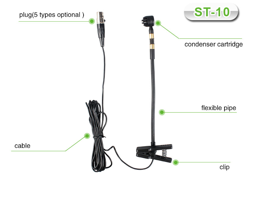 The ST-10 is a high-performance wired saxophone microphone, designed to capture the full spectrum of your instrument's sound with exceptional clarity and detail. Perfect for live performances, studio recordings, and practice, this wired saxophone microphone ensures your playing is heard with natural tone and precision.Equipped with a sensitive cardioid pickup pattern and a frequency response optimized for saxophone, the ST-10 wired saxophone microphone minimizes background noise and focuses on capturing the rich, vibrant sound of your sax. Its secure clip-on design ensures easy setup and reliable mic placement without compromising the instrument.