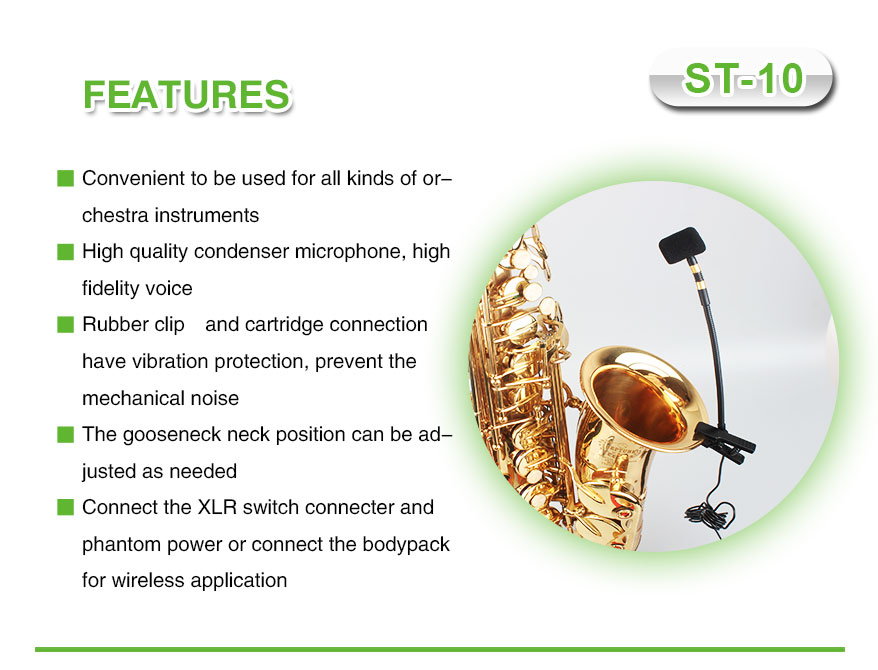 Whether you're a jazz musician, classical performer, or in a studio setting, the ST-10 wired saxophone microphone delivers professional-grade audio to elevate your sound.