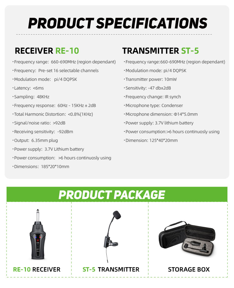 (606-630 MHz Optional), (USA: 902-928, UK: 863-865, ROK: 925-937 MHz)Modulation mode: pi/4 DQPSKTransmitter power: 10mWSensitivity: -47 db±2dBFrequency change: IR synchMicrophone type: CondenserMicrophone dimension: Φ14*5.0mmPower supply: 3.7V lithium batteryPower consumption:>6 hours continuously usingDimension: 125*40*20mm