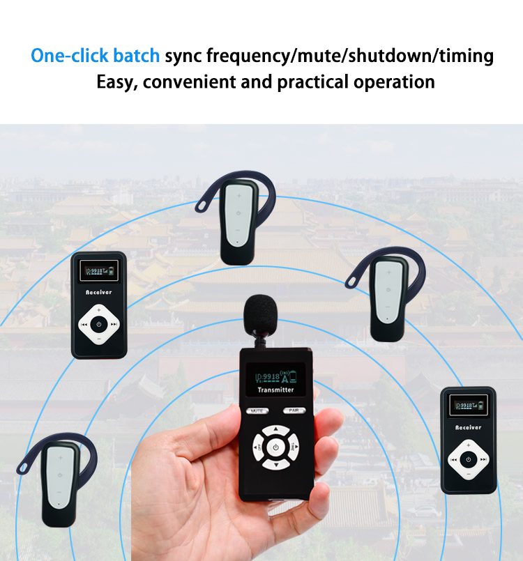 About this item:【Receivers Could Hear Voice from 2 Transmitters Simultaneously】The wireless tour guide system could help the presenter transmit audio voice messages to an audience at a comfortable level without having to shout. The presenter speaks into a mic-transmitter and the audience use lightweight ear-hook receivers to hear the message.What makes it amazing is that receivers could hear voice messages from two transmitters on the same channel,it means that each group support two presenters speaking simultaneously.【Varied Applications】The wireless tour guide system is used when it is difficult for an individual to talk to listeners due to noise or distance. Popular uses are: Factory and plant tours or tours in other noisy environments, Simultaneous translation for multilingual meetings(church or conference),Portable audio description( performing arts such as theatre or dance, or at sporting events),Command Training,Square Dance, .job/sports training, silent commentary.【Advantage Features】The wireless tour guide system enables up to two presenters to talk on the same channel in each group, allowing them to take turns at regular intervals to reduce fatigue.Transmitter also has an AUX input which enables to connect a MP3, Smartphone,MP4 to the system.When presenter speaking with main microphone transmitter,the deputy transmitter could send background music or pre-recorded voice files to receivers.Hundreds of tour groups can operate simultaneously in the same area.【Key Datas】The wireless tour guide system features 9999 Selectable 2.4GHz licence-free world-wide channels accommodating hundreds of groups working on the same place as long as they are on different channels.Used a comfortable level volume to be heard clearly in a noisy environment or over distance.Transmission distance could be up to 120 meters/394ft.The transmitter has mute function.If the interpreter sometimes does not want the audience to hear his speech, he can press the mute button and the audience will not hear his speech.【More detail】The wireless tour guide system's transmitter has built-in 900mAh lithium battery which could be used for 25 hours and receiver built-in 380mAh lithium battery for 23 hours after full charged. Ear-hook receiver only weight 25g and transmitter weight for 75g. Each little device comes with its own charger and lanyard for complete hands-free operation.Receiver could match transmitter's channel automatically,needn't operate one by one.Transmitter could turn off all connected receivers by one click.